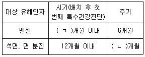 5. 특수건강진단의 시기 및 주기에 관한 산업안전보건법 시행규칙 [별표 23]의 일부이다. ( )에 들어갈 숫자로 옳은 것은? (단, 특수건강진단 주기의 예외 규정은 고려하지 않음)