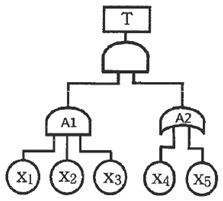 40. 서로 독립인 기본사상 x1~x5 로 구성된 다음의 결함수(Fault Tree)에서 정상 사상 T에 관한 최소절단집합(minimal cut set)을 모두 구한 것은?