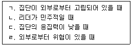 61. 제니스(I. Janis)가 제시한 집단사고(groupthink)가 발생할 가능성이 높은 상황을 모두 고른 것은?