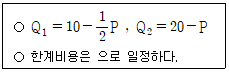 63. 두 명의 수요자로 구성된 X재 시장에 관한 설명으로 옳은 것은? (단, P는 가격, Q1과 Q2는 각각 개인 1과 2의 수요함수)