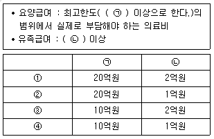 20. <보기>는 「연구실 안전환경 조성에 관한 법률 시행규칙」에 따라 연구주체의 장이 가입하여야 하는 보험의 보험급여 종류 및 보상금액에 관한 내용이다. ( ) 안에 들어갈 말로 옳은 것은?