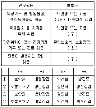 130. 다음은 「연구실 안전환경 조성에 관한 법률 시행규칙」에서 규정하는 연구활동별 적합한 보호구에 관한 내용이다. ( ) 안에 들어갈 말로 옳은 것은?