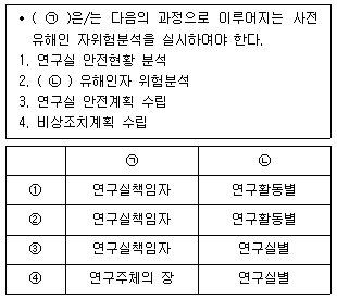 19. <보기>는 「연구실 안전환경 조성에 관한 법령」에서 규정하는 사전유해인자위험분석에 관한 설명이다. ( ) 안에 들어갈 말로 옳은 것은?