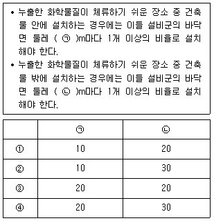 51. 「고압가스 특정제조의 시설‧기술‧검사‧감리‧정밀 안전검진기준」에서는 가스누출검지경보장치의 검출부 설치장소 및 설치개수를 규정하고 있다. ( ) 안에 들어갈 숫자로 옳은 것은?