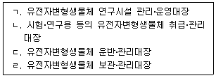 93. 대학교에서 미생물 연구를 위하여 시험‧연구용 LMO 연구시설 운영 시 「유전자변형생물체의 국가간 이동 등에 관한 통합고시」에 따라 필수적으로 작성 및 보관해야 하는 서류만을 <보기>에서 모두 고른 것은?