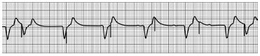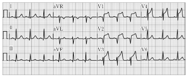 25. 55세 남자가 회의 도중 가슴을 짓누르는 듯한 통증과 답답함을 호소한다. 현장에 도착한 구급대원이 시행한 심전도가 다음과 같을 때 의심할 수 있는 소견으로 옳은 것은?