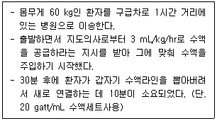 14. 다음 환자에게, 남은 20분 안에 지시받은 수액을 모두 주입하기 위해 새로 설정해야할 수액 주입속도로 옳은 것은?
