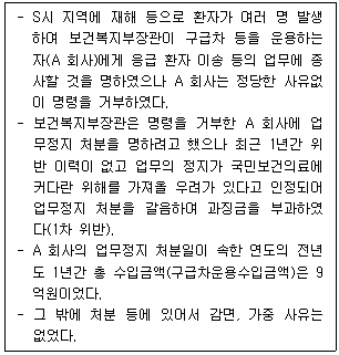 39. 다음 내용을 읽고 「응급의료에 관한 법률」 및 같은 법 시행령, 시행규칙상 A 회사에 업무정지 처분을 갈음하여 부과한 과징금의 총금액으로 옳은 것은?