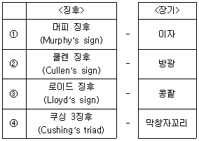 13. 복부 또는 복부 주변 장기의 통증을 호소하는 환자의 감별에는 특징적인 징후가 도움이 된다. 징후와 장기의 연결이 바른 것은?