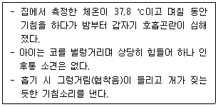10. 다음과 같은 증상을 보이는 3세 환아에 대한 처치로 가장 옳은 것은?