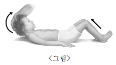 9. 8세 소아가 며칠 전부터 감기 증상을 보이다가 두통이 점점 심해지고 의식변화가 있다. 구급대원이 <그림>처럼 누운 환아의 머리를 가슴 쪽으로 구부려보았더니 환아의 무릎이 저절로 구부러졌다. 이에 대한 설명으로 옳은 것은?