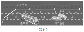 37. 교통사고 현장에 펌프차와 구급차가 출동하였다. <그림>과 같이 펌프차가 먼저 도착해서 현장 안전을 확보하였을 때 뒤에 도착한 구급차의 정차 위치로 옳은 것은? (단, 화재, 유독 가스, 화학 물질 등의 사고는 없는 현장이다.)