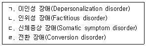 1. 해리장애(Dissociative disorder)에 속하는 유형만을 <보기>에서 모두 고른 것은? (「미국정신의학협회 정신질환 진단 및 통계 매뉴얼(DSM-5-TR)」 기준)