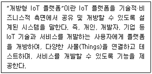 1. 표준화 : 많은 업체가 생산하는 다양한 부품이 사물인터넷 디바이스에 문제 없이 사용되어야 한다.