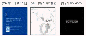 29. 영상정보관리사 A 씨는 관제 중 아래와 같은 모니터 화면 장애를 확인하였다. 각 화면 현상의 원인에 대한 설명으로 옳지 않은 것은?