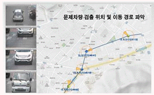 37. 다음 그림은 문제차량이 검출되어 이동 경로가 파악되고 있는 과정이다. CCTV 촬영 방향을 표출하며 차량 이동 경로를 예측할 수 있는 CCTV 제어기능으로 거리가 먼 것은?