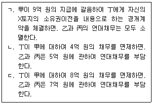 20. 甲, 乙, 丙이 丁에 대하여 부담부분이 균등한 9억 원의 연대채무를 부담하는 경우에 관한 설명으로 옳은 것을 모두 고른 것은? (원본만을 고려하며, 다툼이 있으면 판례에 따름)