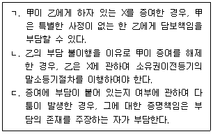 33. 甲은 乙과 '乙이 甲에 대하여 일정한 부담을 이행할 것'을 내용으로 하는 부담부증여계약을 체결하고, 증여를 원인으로 甲소유의 X토지에 관하여 乙에게 소유권이전등기를 경료해 주었다. 이에 관한 설명으로 옳은 것을 모두 고른 것은? (다툼이 있으면 판례에 따름)