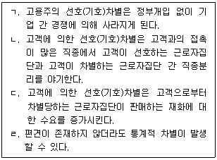 36. 제품시장과 요소시장이 완전경쟁이고 모든 근로자의 생산성은 동일할 때, 아래 노동시장 차별에 관한 설명으로 옳은 것을 모두 고른 것은?