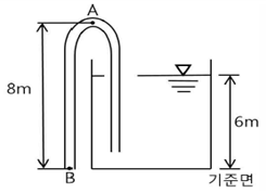 를 속도수두, z를 위치수두라 한다.67. 그림과 같이 수심 6 m의 수조에 직경 100 mm인 사이폰이 설치되어 있다. 관의 최하단은 수조의 바닥 기준면과 같은 높이이다. 유출구 B로부터 사이폰의 정점 A까지의 높이가 8 m일 때 사이폰을 통해 흐르는 유량(m3/s)은? (단, 에너지손실은 무시한다.)