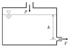 64. 그림과 같은 물탱크에서 수심(h)이 4m인 위치에 작은 오리피스가 설치되어 있다. 수면 위 공기층의 계기압력(p)을 30kPa로 유지시킬 때, 오리피스에서의 토출유속(m/s)은 약 얼마인가? (단, 오리피스의 유속계수는 0.7, 물의 밀도는 1,000kg/m3, 중력가속도는 9.8m/s2이다.)