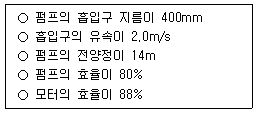 80. 다음 조건의 모터 소요동력(kW)은 약 얼마인가? (단, 중력가속도는 9. m/s2, 물의 단위중량은 1,000kgf/m3이다.)