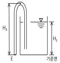 63. 그림과 같이 수심 H1인 수조에 직경 D인 사이폰(syphon)이 설치되어 있다. 관의 최하단 유출구 E는 수조의 바닥 기준면과 같은 높이이고 유출구 E로부터 사이폰 정점까지의 높이가 H2일 때, 다음 중 사이폰을 통해 흐르는 유속으로 옳은 것은? (단, 에너지손실은 무시한다.)