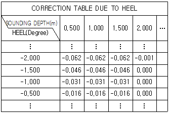 14. 선박의 힐(heel) 각도가 -1.3°이고, 유류 탱크의 사운딩 깊이(sounding depth)가 1.3m 일 때, 아래의 힐 보정 테이블(correction table due to heel)을 사용하여 보정된 사운딩 깊이는 몇 m인가?
