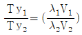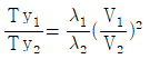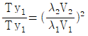 6. 그물 어구의 상사법칙에서 예인 속도를 V, 길이를 λ, x 및 y 방향의 장력을 각각 Tx, Ty 모형에는 첨자 1, 실물에는 첨자 2를 붙였을 때 가장 바르게 표현한 것은?