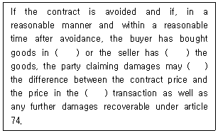 38. 다음은 국제물품매매계약에 관한 유엔협약(비엔나협약, 1980)상의 '계약해제 시 손해배상금의 산정'에 관한 내용이다. ( )에 들어갈 용어를 순서대로 바르게 나열한 것은?