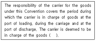 20. 해상화물운송에 관한 유엔협약(Hamburg Rules 1978) 제4조 '책임의 기간(Period of responsibility)'에 대한 규정이다. ( )안에 들어갈 내용으로 옳지 않은 것은?