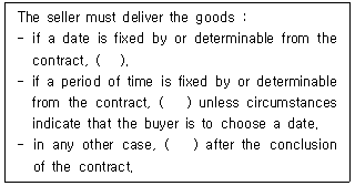 7. 국제물품매매계약에 관한 유엔협약(CISG, 1980) 제33조 '물품의 인도시기'에 관한 규정이다. ( ) 안에 들어갈 용어를 순서대로 바르게 나열한 것은?