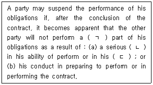 1. 국제물품매매계약에 관한 유엔협약(CISG, 1980) 제71조 '이행의 정지'와 관련된 규정이다. ( ) 안에 들어갈 용어를 순서대로 바르게 나열한 것은?