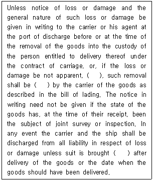 23. 선화증권에 관한 법규의 통일을 위한 국제협약(Hague Rules, 1924) 제3조 '운송인의 책임사항'에 관한 규정이다. ( ) 안에 들어갈 내용을 순서대로 바르게 나열한 것은?