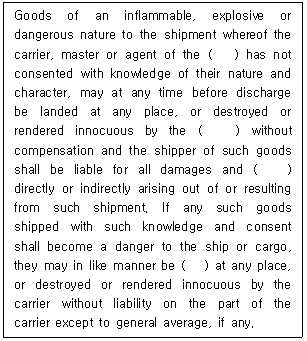 35. 선화증권에 관한 법규의 통일을 위한 국제협약(Hague Rules, 1924) 제4조 '운송인의 면책'에 관한 규정이다. ( ) 안에 들어갈 용어를 순서대로 바르게 나열한 것은?