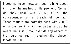 8. Incoterms® 2010상의 서문(Introduction) 내용 일부이다. ( ) 안에 들어갈 용어로 옳지 않은 것은?
