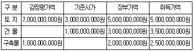 9. 사업자가 토지, 건물, 구축물의 가액을 구분하지 아니하고 일괄양도 하였으며, 양도일에 대금전액 10,000,000,000원(부가가치세 제외)을 수령하고 소유권 이전등기를 완료하였다. 양도일 현재 관련되는 가액이 다음과 같을 경우 양도와 관련된 부가가치세 과세표준은 얼마인가? (단, 제시된 조건 이외의 사항은 고려하지 않는다.)
