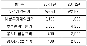 13. (주)관세는 20×1년 1월 1일 지방자치단체와 복합스포츠센터를 건립하는 공사계약을 체결하였다. 이 공사의 계약금액은 ₩4,000이며, 20×3년 중에 완공될 예정이다. 20×1년과 20×2년의 공사관련 자료는 다음과 같다.