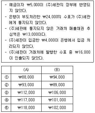17. 다음 자료는 20×1년 12월 31일 기준 (주)세관의 은행계정 조정에 관한 자료이다. 이 자료를 이용하여 20×1년 12월 31일 조정전 은행측 잔액(A)과 조정 전 회사측 잔액(B)을 계산하면 각각 얼마인가? (단, 조정후 (주)세관의 잔액은 ₩100,000이라고 가정한다.)