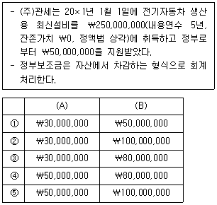 19. 다음은 (주)관세의 유형자산 취득 관련 자료이다. 20×2년 12월 31일의 정부보조금 잔액(A)과 20×1년과 20×2년의 2년간 감가상각비 합계액(B)은 각각 얼마인가? (단, 정부보조금에 부수되는 조건의 준수에 대한 합리적인 확신이 있다고 가정한다.)