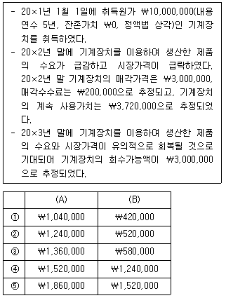 21. 다음은 (주)세관의 기계장치에 관한 자료이다. 20×3년도 감가상각비(A), 손상차손환입액(B)은 각각 얼마인가? (단, (주)세관은 기계장치에 대하여 원가모형을 채택하고 있다고 가정한다.)