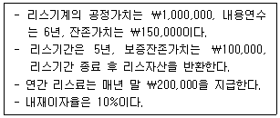 26. (주)관세는 20×1년 1월 1일 (주)리스와 다음과 같이 금융리스계약을 체결하였다.