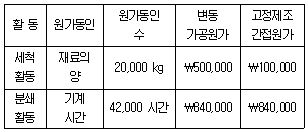 34. (주)관세는 활동기준원가계산을 사용하고 있다. A제품 1단위 생산을 위해서는 원재료가 5 kg, 분쇄작업이 10시간 소요된다. A제품의 단위당 판매가격은 ₩9,000, A제품에 투입된 원재료는 kg당 ₩1,200이다. 다음 (주)관세의 연간활동원가 자료를 이용하여 계산한 A제품의 단위당 제조공헌이익은 얼마인가?