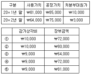 13. (주)관세는 보유 중인 유형자산에 대해 원가모형을 적용하고 있다. 20×1년 초 ₩100,000에 취득한 건물에 대해서 정액법(내용연수 10년, 잔존가치 ₩0)으로 감가상각하고 있다. 이 건물의 사용가치, 공정가치, 처분부대원가에 관한 자료가 다음과 같을 때, 건물에 대한 20×2년 감가상각비와 20×2년 말 장부금액은 각각 얼마인가?