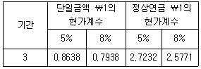 23. (주)관세는 20×1년 1월 1일에 만기 3년인 전환사채(액면 ₩1,000,000)를 ₩1,000,000에 발행하였다. 표시이자율은 5%이며, 발행한 전환사채와 유사한 위험을 가진 일반사채의 시장이자율은 8%이다. 이자는 매년 12월 31일에 지급하며, 전환사채 액면 ₩10,000당 1주의 보통주(액면 ₩5,000)로 전환할 수 있다. 전환사채 발행시 전환권대가는 얼마인가? (단, 현가계수는 다음의 표를 이용한다.)