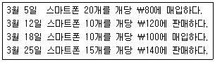 3. (주)관세는 스마트폰을 매입하여 판매하는 기업으로 한 가지 모델만을 취급하고 있다. (주)관세는 계속기록법으로 재고자산을 회계처리하고 있으며 단가는 가중평균법으로 계산하고 있다. 3월 초 보유중인 스마트폰은 10개이고 단가는 ₩50이며, 3월 한 달간 스마트폰의 매입과 매출에 관한 기록은 다음과 같다. 3월 말 재고자산은 얼마인가?