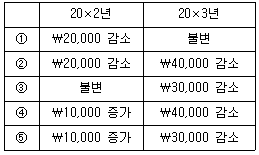 9. (주)관세는 20×1년 초에 토지를 ₩150,000에 취득하였으며, 매년 말 재평가 모형에 따라 회계처리하고 있다. 토지의 공정가치는 20×1년 말 ₩180,000, 20×2년 말 ₩160,000, 20×3년 말 ₩120,000이다. 토지의 재평가가 20×2년과 20×3년의 당기순이익에 미치는 영향은?