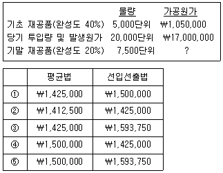 35. 다음은 종합원가계산을 적용하고 있는 (주)관세의 가공원가와 관련된 자료이다. 기말재공품에 포함된 가공원가를 평균법과 선입선출법에 의해 각각 계산한 금액은? (단, 가공원가는 공정전체를 통해 균등하게 발생하며 공손 및 감손은 발생하지 않았다.)