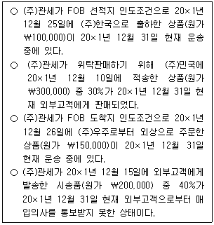 20. 다음은 20×1년 초에 설립하여 단일 품목의 상품을 판매하는 (주)관세의 20×1년 말 상품재고에 관한 자료이다.