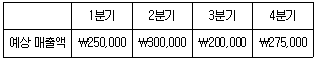 분기별 예상 매출액 중 현금매출은 40%이며, 외상매출은 60%이다. 외상매출은 판매된 분기(첫 번째 분기)에 60%, 두 번째 분기에 30%, 세 번째 분기에 10%가 현금으로 회수된다. 20×1년 매출과 관련하여 3분기에 예상되는 현금유입액은?